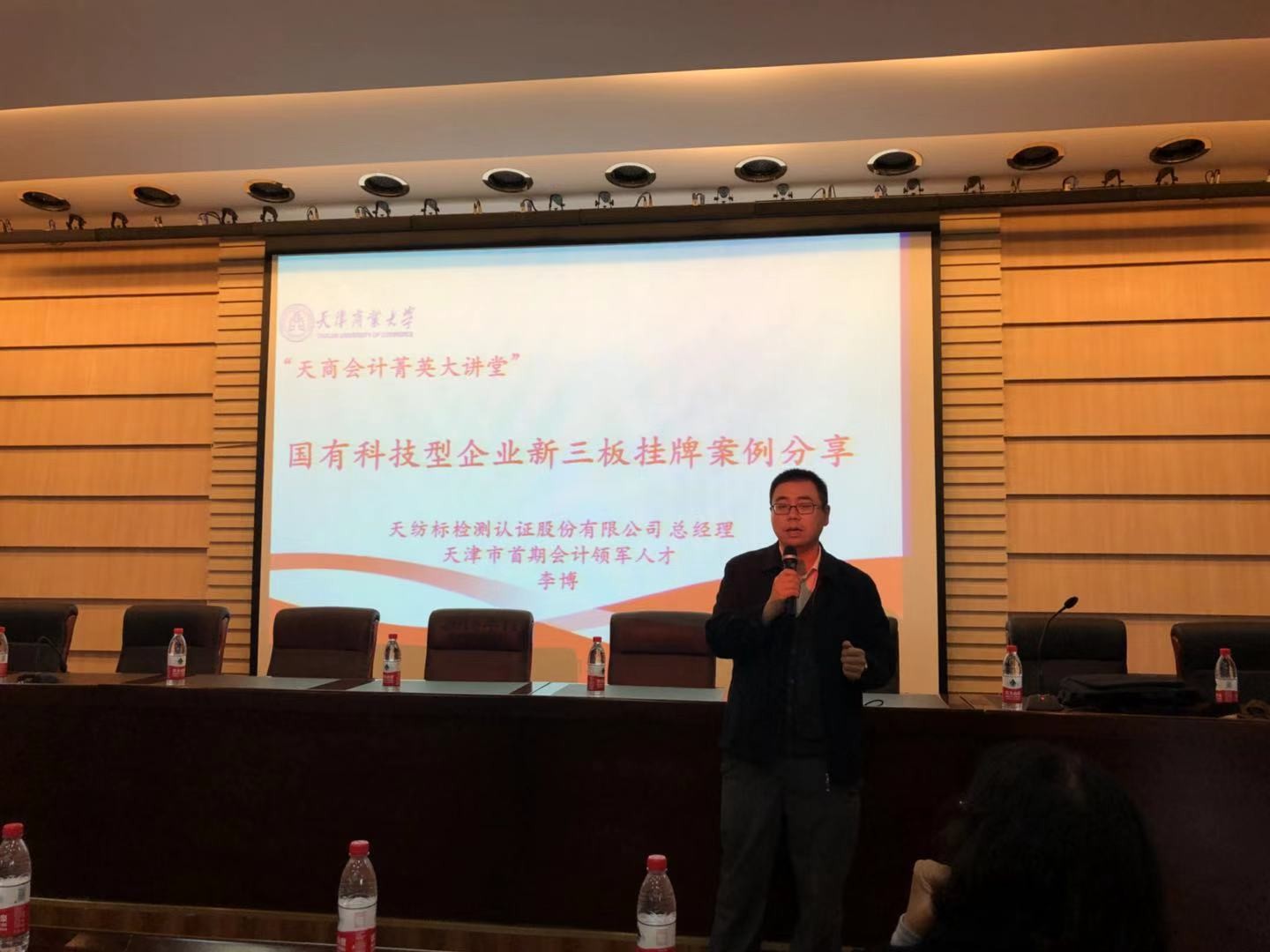 随后,“天商会计菁英大讲堂”隆重开讲,首期讲堂由天津市首期会计领军人才、天纺标检测认证股份有限公司总经理李博为各位研究生做“国有科技型企业新三板挂牌案例”的精彩分享。天纺标检测认证股份有限公司,简称天纺标,英文缩写TTTS,证券代码:871753,隶属于天津纺织集团(控股)有限公司,是一家集检测、科研、标准化制定、信息媒体为一体的科技型服务企业,同时也是一家高新技术企业,于2017年8月14日实现在新三板挂牌。李博总经理详细介绍了这家国有企业的公司功能定位与设立、业务整合与重组、股份制改造与挂牌的过程,并就员工激励、股份期权设计、关联业务管理与披露等热点和难点问题进行详细讲解,指出,伴随着公司的发展自己也从最初的财务总监成长为公司的总经理,分享了一个财务人的成长经验和心得体会,李博总经理的精彩分享受到全体研究生的热烈欢迎。