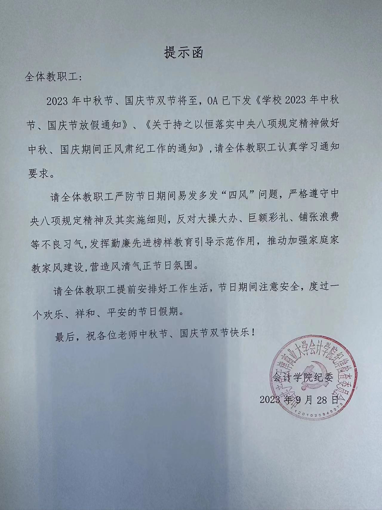 伟德国际VICTOR1946纪委关于中秋节、国庆节的提示函