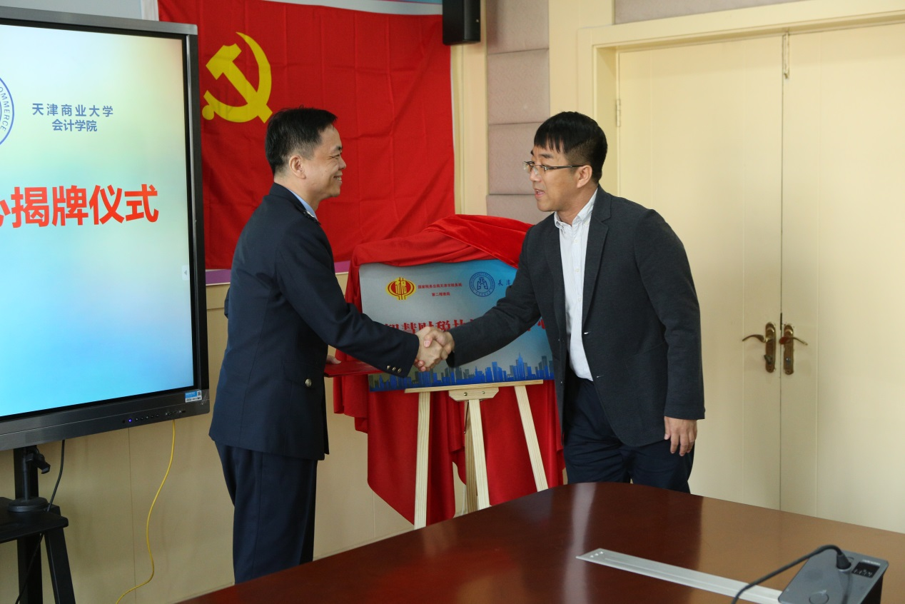 天津市税务局第二稽查局机关党委书记、局长庞志强,公司财务处副处长王砚,会计公司党委书记曹军、副经理白默及有关教师、员工参加签约活动,双方代表共同为“税校联合实训基地”“智慧财税协同创新中心”“智慧财税协同研究功能型党支部”揭牌。